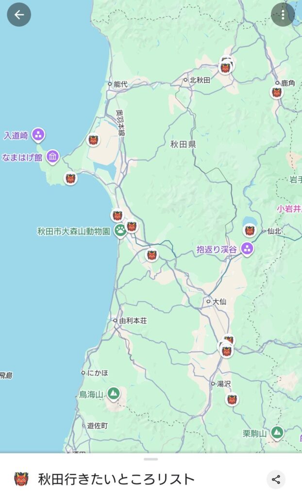 すると、「佐藤養助の稲庭うどん」「本家あべやの親子丼」「乳頭温泉・鶴の湯の山芋鍋」など、美味しそうな情報が次々と…!教えてもらった場所や気になった観光地をGoogleマップで検索してはピンを打つ作業を繰り返していたら、あっという間に秋田県がピンだらけになりました👹(笑)